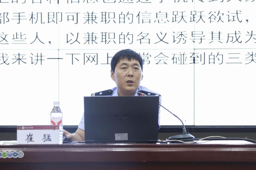 王肃桥队长为同学们介绍了如何防范大学生发生违法犯罪行为的方法措施,崔猛主任结合实际案例,深入浅出地讲解了电信网络诈骗的特点、危害以及应对策略,让师生们对电信网络诈骗有了更直观、更深刻的认识。